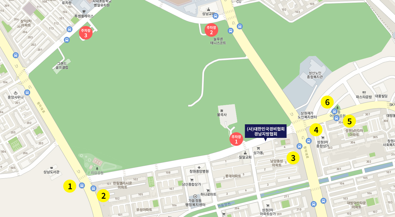 ※ 당 교육관 주차장이 협소한 관계로 교육생들은 되도록 대중교통을 이용하여 주시고 부득이한 경우 차를 가져오실때는 인근 무료주차장 (주차장1:불곡사, 주차장2:상남교회 건너편, 주차장3:삼익아파트 건너편)을 안내해드리오니 참고하시기 바랍니다.